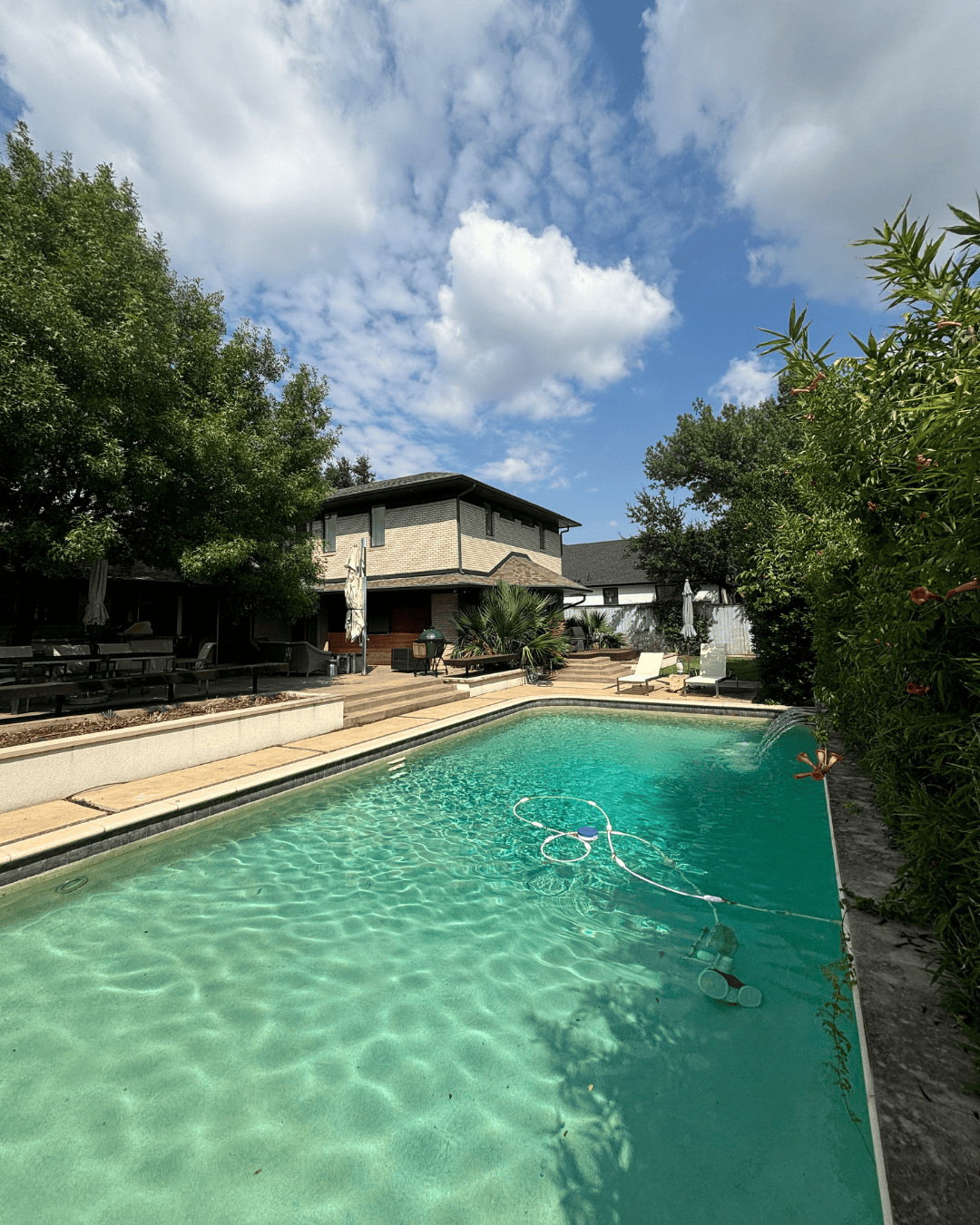 The existing property had strong bones but needed a thoughtful facelift. The original pool was approximately 10 feet deep, which limited casual use and entertaining. It lacked shallow lounging areas, and the cream-and-white finishes had become dingy over time. The fire pit, retaining walls, and kitchen were functional but visually dated and undersized for the way the family wanted to gather.