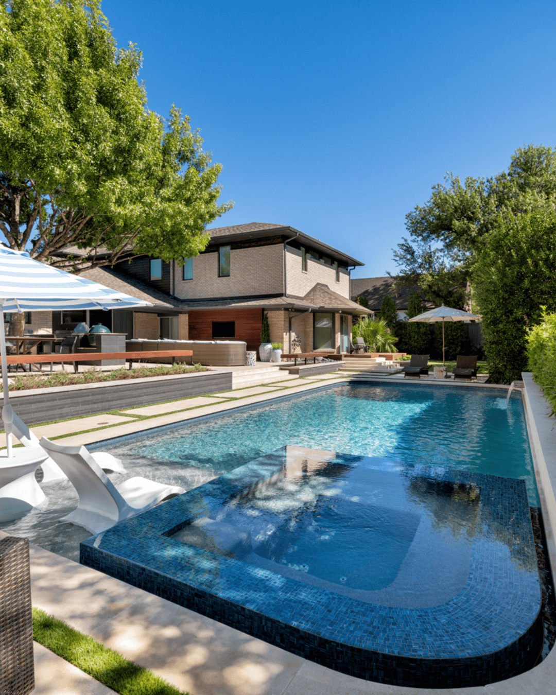 The clients wanted a space that felt updated, elevated, and highly usable. They envisioned a spa that read as a design feature, better outdoor cooking capabilities, and a cleaner, more modern aesthetic that would stand the test of time.